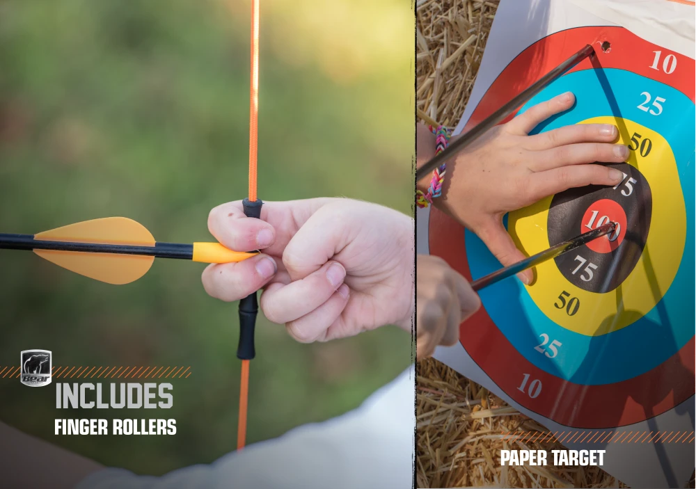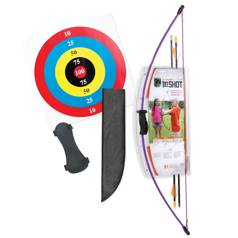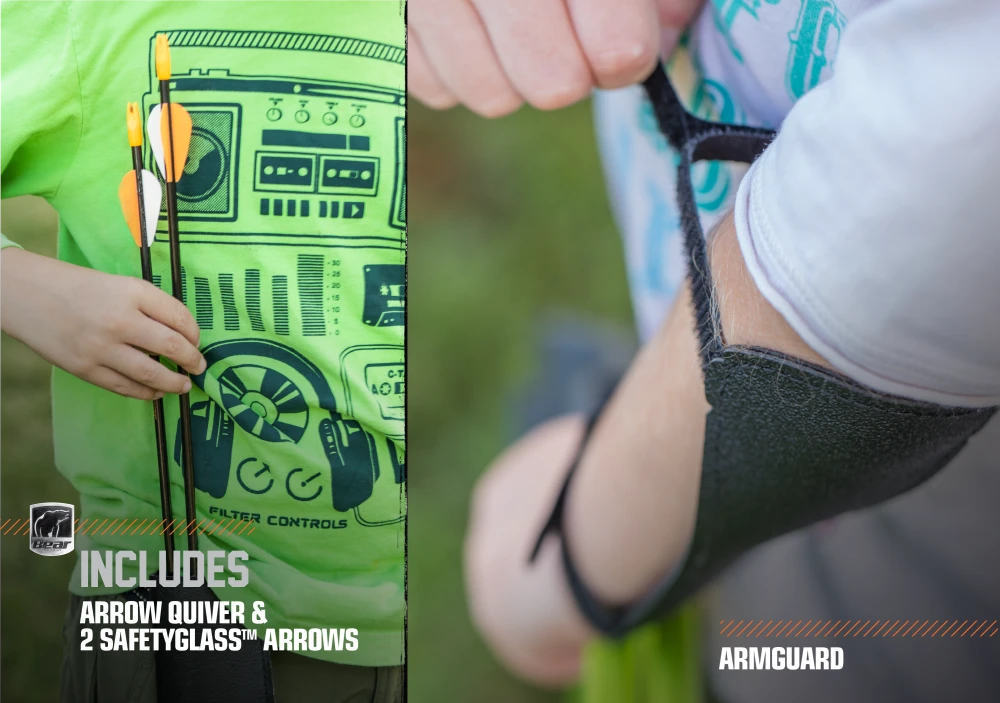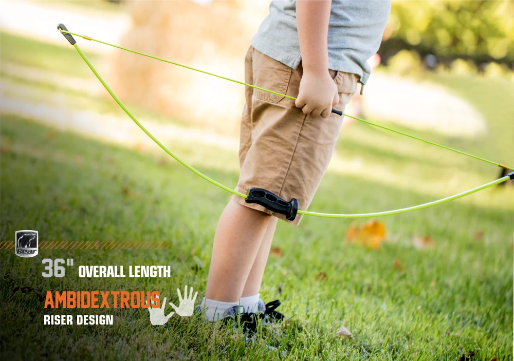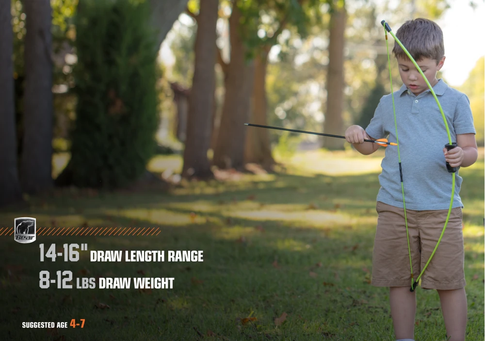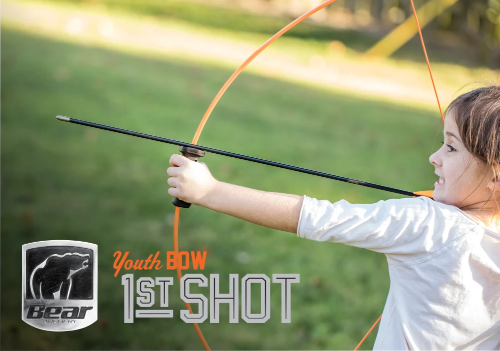 For more than 80 years, Bear Archery has been America’s No. 1 brand in youth and institutional archery. The 1st Shot Youth Bow Set comes ready to shoot with two Safetyglass™ arrows and a paper target. The set also includes finger rollers, armguard, and arrow quiver. The recommended age range for children is 4 to 7 years old. The 1st Shot is a 36-inch-long ambidextrous bow that features durable composite limbs and a 8-12 lb. draw weight and a 14- to 16-inch draw length range. Choose from four different color options. It’s never too early to share Bear with the next generation of archers.