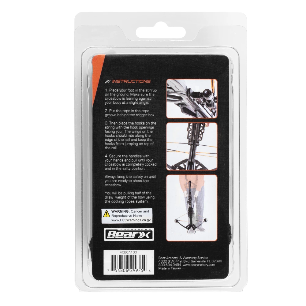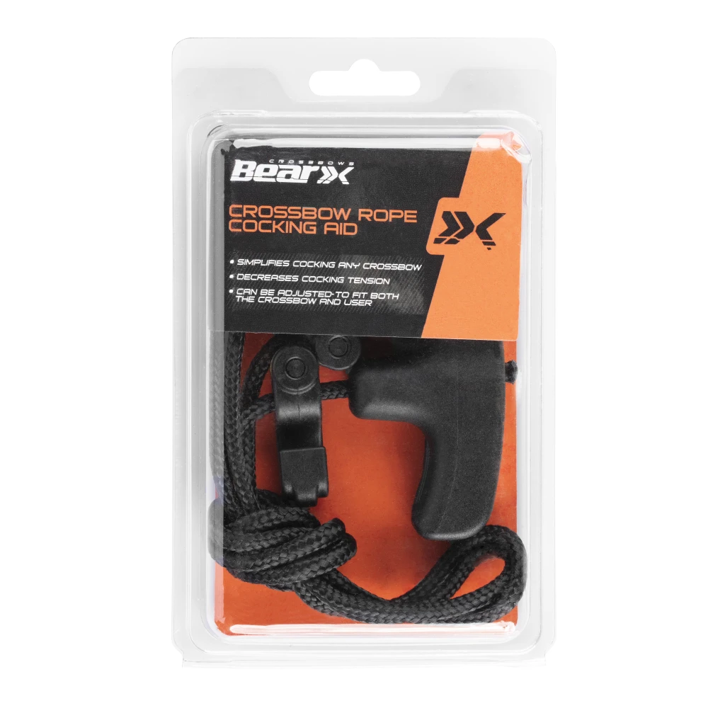 The Bear X Crossbow Cocking Rope reduces cocking effort by 50% to make this easier for you. The cocking aid is adjustable for crossbows and user. The user-friendly double handle design simplifies the process of cocking any crossbow while ensuring a torque-free power stroke.