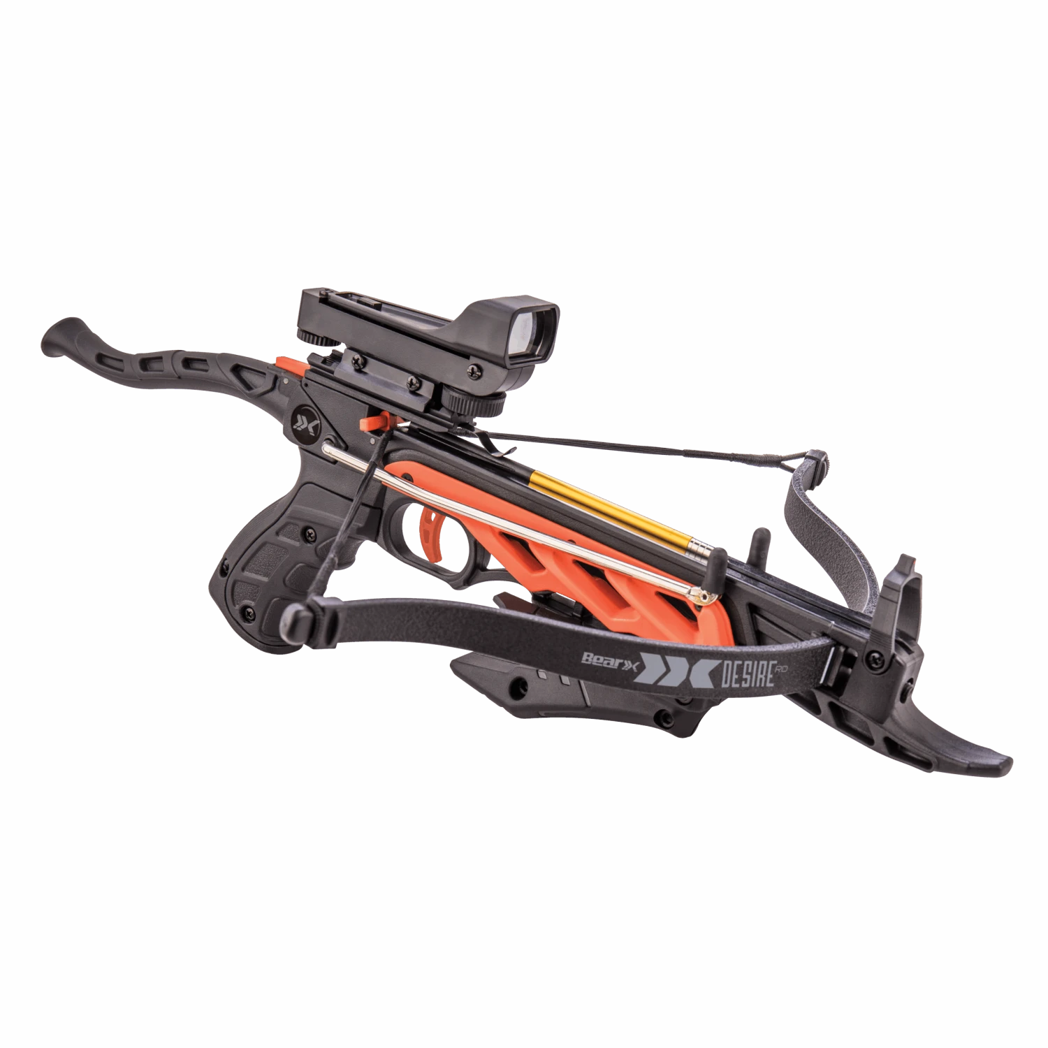 The Bear X Desire RD is the ultimate compact pistol crossbow with red dot sight. Weighing just 1.9 lbs., it’s equipped with a forearm grip and self-cocking arm for easy use and safety.