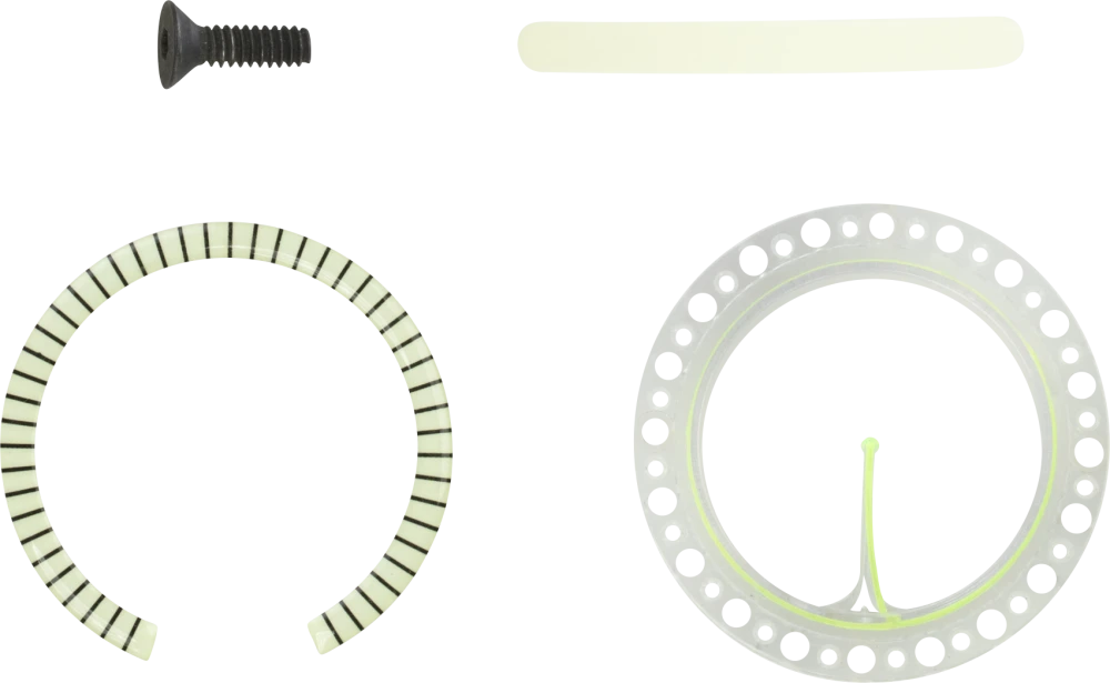 Includes one glow ring for pin guard, one indicator pin, one yardage tape, and one screw for windage lock down