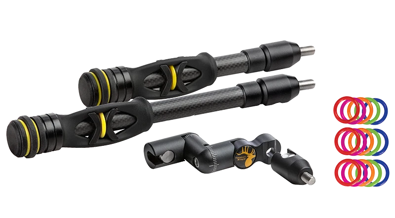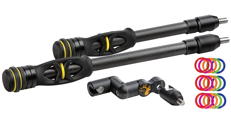The Trophy Ridge Hitman Stabilizer eliminates noise and vibration while improving your bow’s balance while holding at full draw. Each combo includes two stabilizers with the quick connect system of the Trophy Ridge stabilizers with a target carbon design. The quick connect system also allows for fast removal of the stabilizer for convenient transport and storage. Pre-assembled with two removable 1 oz. weights, the Hitman Combo includes colored rings (red, orange, blue, green, purple, and yellow) for bow personalization. Choose from a 6″ and 8″, 8″ and 10″, or 10″ and 12″ combo.