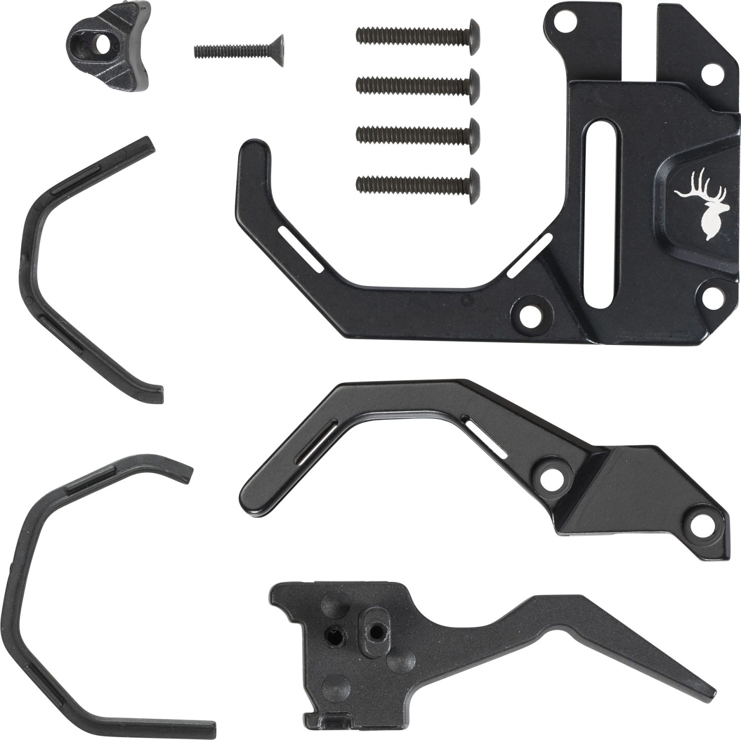 Includes four cover plate screws, one rubber for the containment arm, one top containment arm, two containment arm screws, one replacement cover, one rest arm, one cocking button, and one screw for cocking button