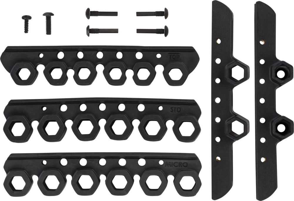 Includes one micro gripper, one standard gripper, one bottom gripper, four gripper retaining screws, one gripper mount bottom, one gripper mount top, one top gripper placement screw, and one bottom gripper retaining screw