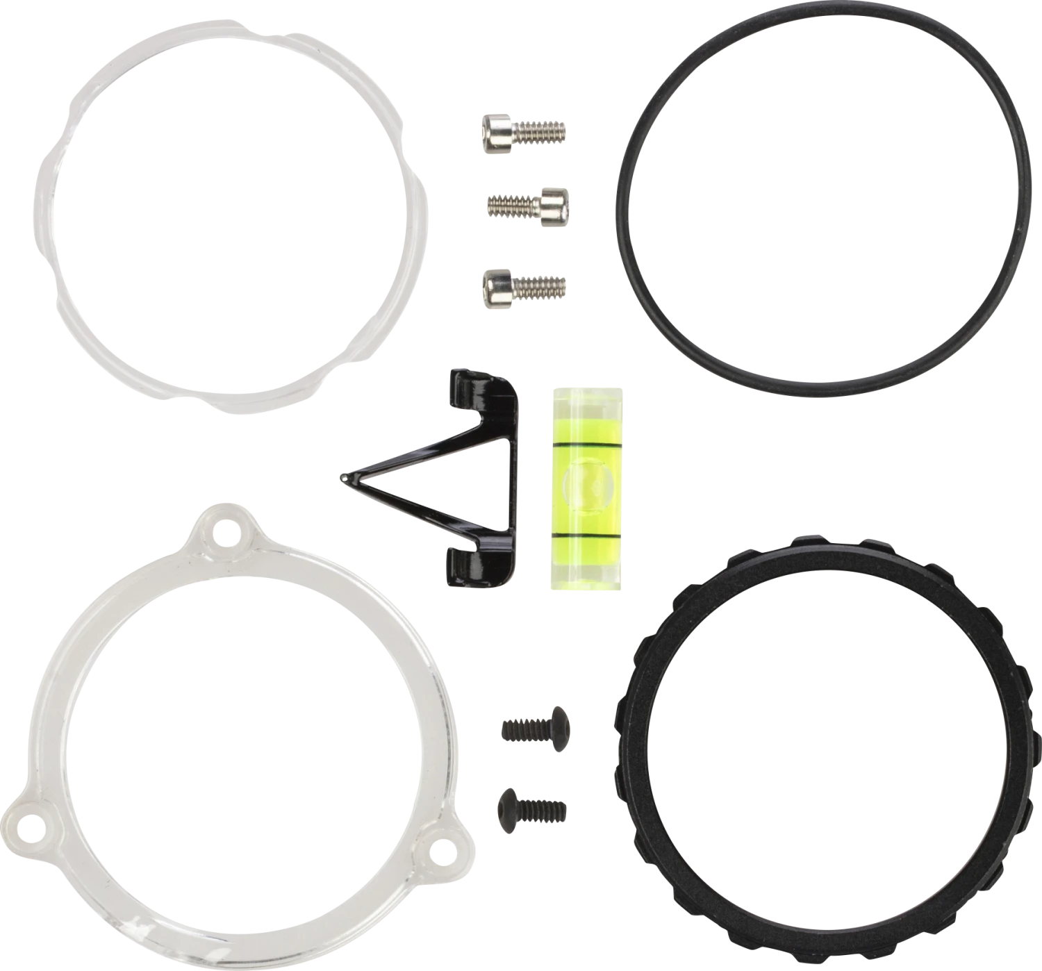 Includes one clear housing for fiber front, one clear housing for fiber inner, three screws for clear housing, one upside down V pin, two screws for pin, one level, one lens retainer, and one lens retainer o-ring