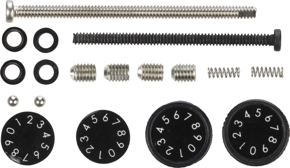 Includes one micro knob, one 2.325 long micro adjust screw, one 1.925 long micro adjust screw, four 10-32 x .25 SS set screw cup points, two micro knob label, four small flange bushings, two ball bearings, and two springs