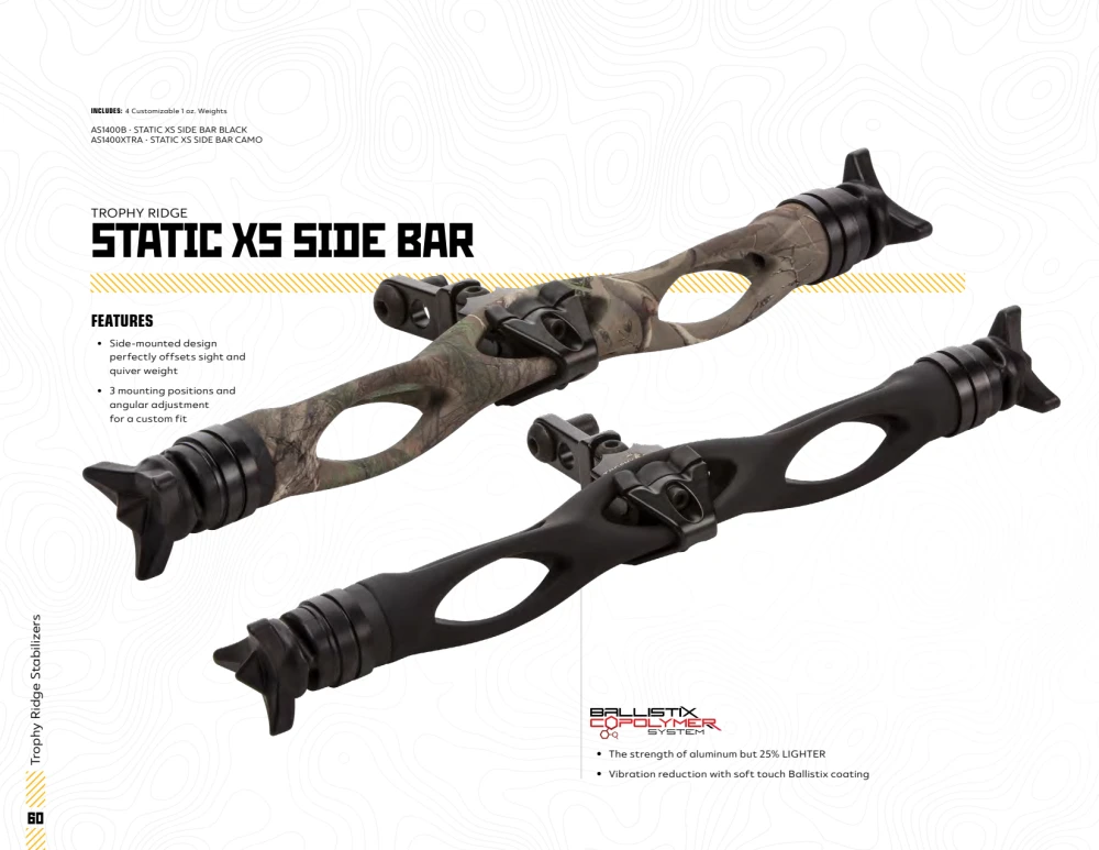 There is no other stabilizer out there quite like the Static Series Stabilizers from Trophy Ridge. The Static Stabilizer comes with customizable weights allowing you to control the weight and balance of the stabilizer depending on the situation. The Static Stabilizers also feature our popular Ballistix CoPolymer system, which is 25% lighter than aluminum, but with the same strength. Serious stabilizers, for serious hunters.