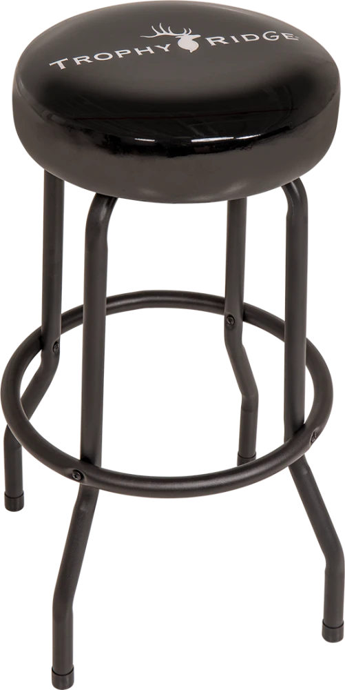 Pull up a seat to your favorite workspace with your new Trophy Ridge Logo Stool. This 29-inch-tall stool is the perfect addition to any workshop, mancave, or bar and is finished with the Trophy Ridge logo. The vinyl seat is durable and easy to clean. The conveniently attached 360-degree footrest allows the stool to be usable from any direction. This bar stool is easy to assemble, and the frame is made of durable steel tubing with a black powder-coated finish.