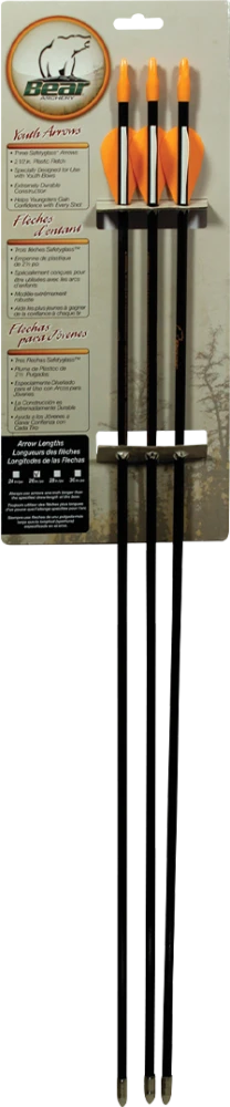 Give your youth archer the best chance to develop their skills with America’s No. 1 brand in youth archery – Bear Archery. Safetyglass™ arrows are strong, durable, and safe. These fiberglass arrows feature high-flexing qualities and will not splinter. Arrows come with nock and points installed and pre-fletched with vanes. Caution: Arrow spine weight must match or be higher than bow weight.